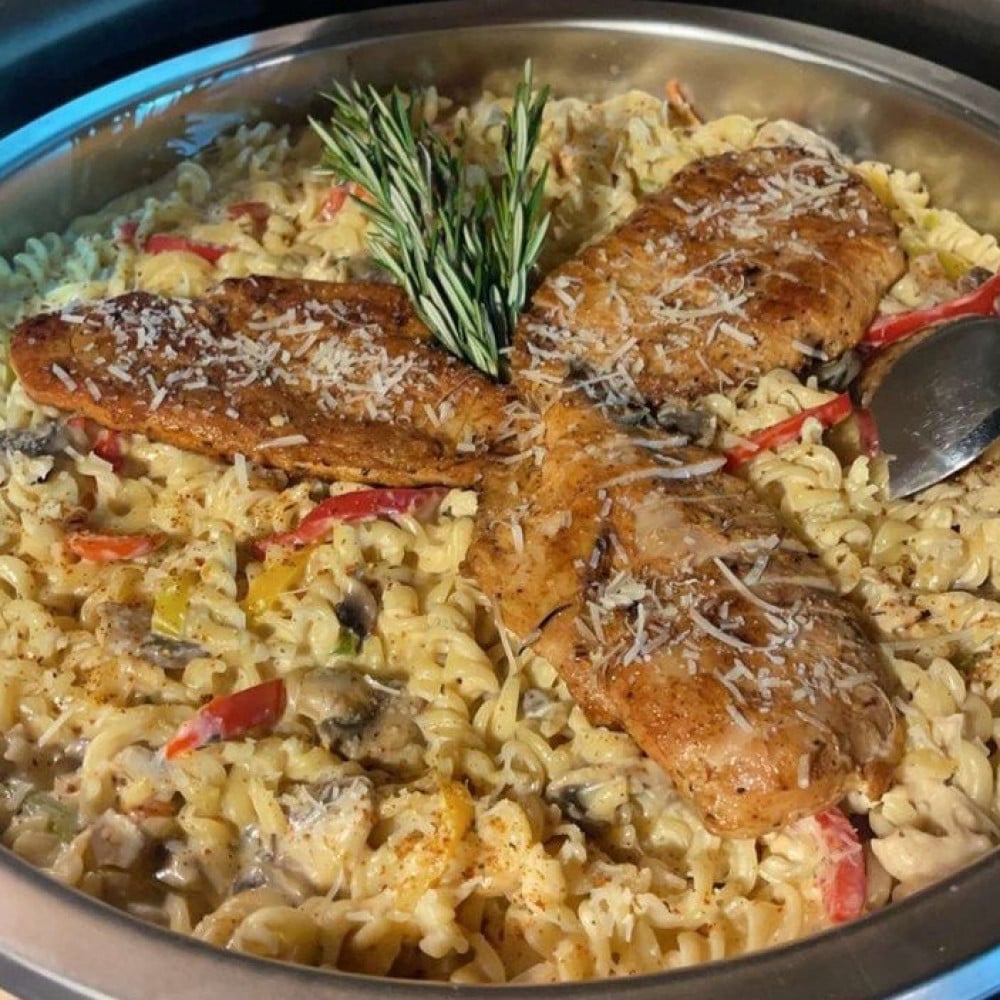 باستا بنكهة الكيجن المميزه والماشروم تقدم مع الدجاج المشوي